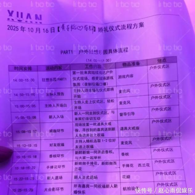 婚礼桥段还没开始前几天,就传出消息说黄子韬会叫鹿晗和张艺兴一起“献礼”,甚至有人把黄子韬婚礼的座位当成“演唱会门票”炒出了高价。幸亏工作室一再澄清,没想到在婚礼当天流程还被曝光了。了解到,黄子韬和徐艺洋的婚礼从下点开始,一直举行点半,刚好避开了吃饭的时段。整个婚礼流程,差不多分钟就搞定了。其实耗时间最多的还是“狂想乐园”这个游戏的环节。